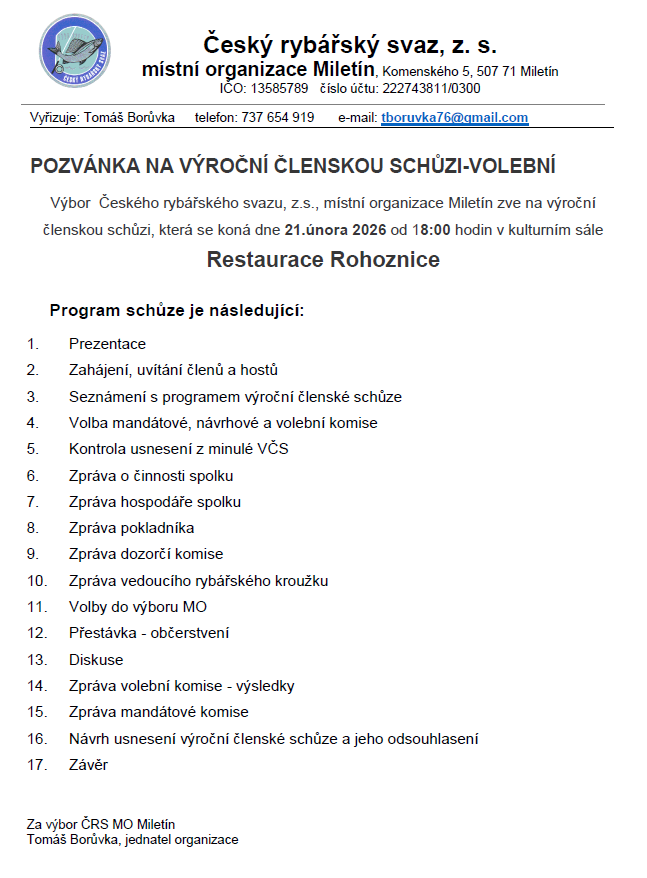 Výroční členská schůze – volební 2026Napsal Tomáš Borůvka / 15. 1. 2026 Vážené rybářky a rybáři, tímto si Vás dovolujeme pozvat na Výroční členskou schůzi MO Miletín, která se uskuteční dne 21.2.2026 od 18:00 hodin v prostorách KULTURNÍHO SÁLU rESTAURACE rOHOZNICE. Výbor MO MILETÍN